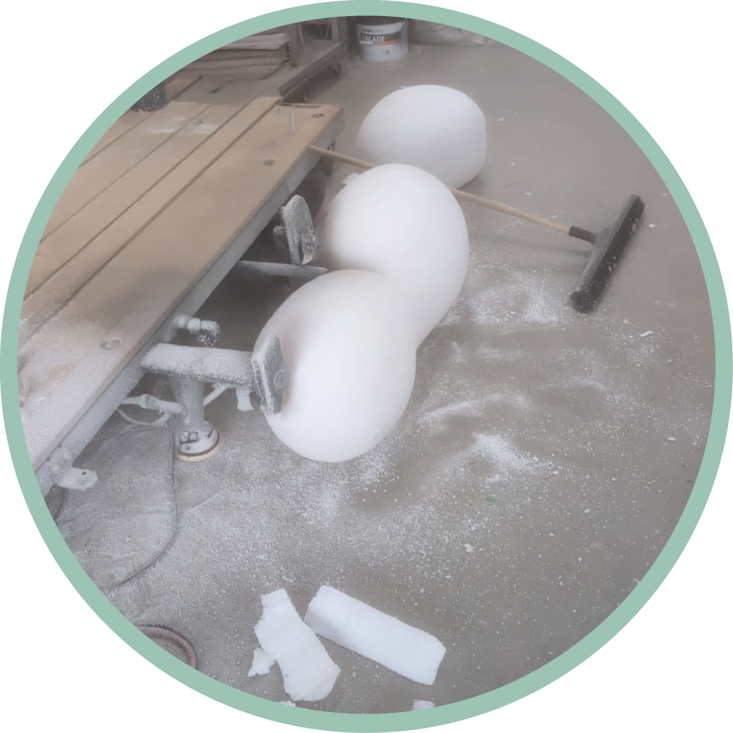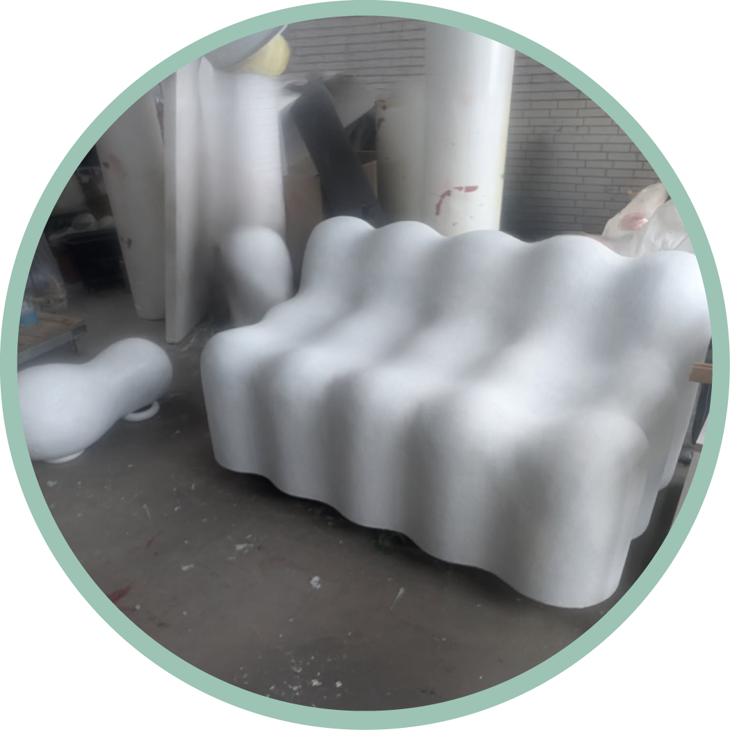 På under tre uger – midt i sommerferien – fik jeg specialfremstillet CloudSeats i let, men holdbar skum, beklædt med en kraftig coating og lakeret, så de kunne holde til turné og transport.